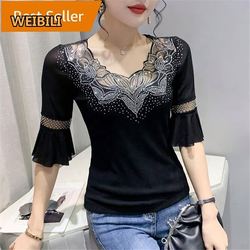 Scollatura a V da donna con stampa floreale strass lucido paillettes mezza manica in cotone vestiti t-shirt da discoteca t-shirt da festa